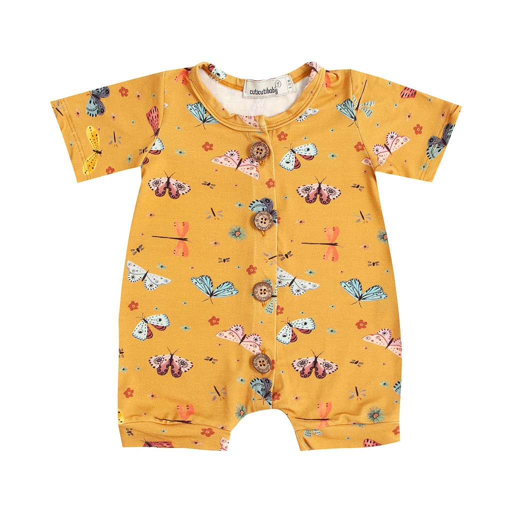 Macacão curto perfeito para o Verão, com aplicação de botão natural de coco personalizado na parte da frente.