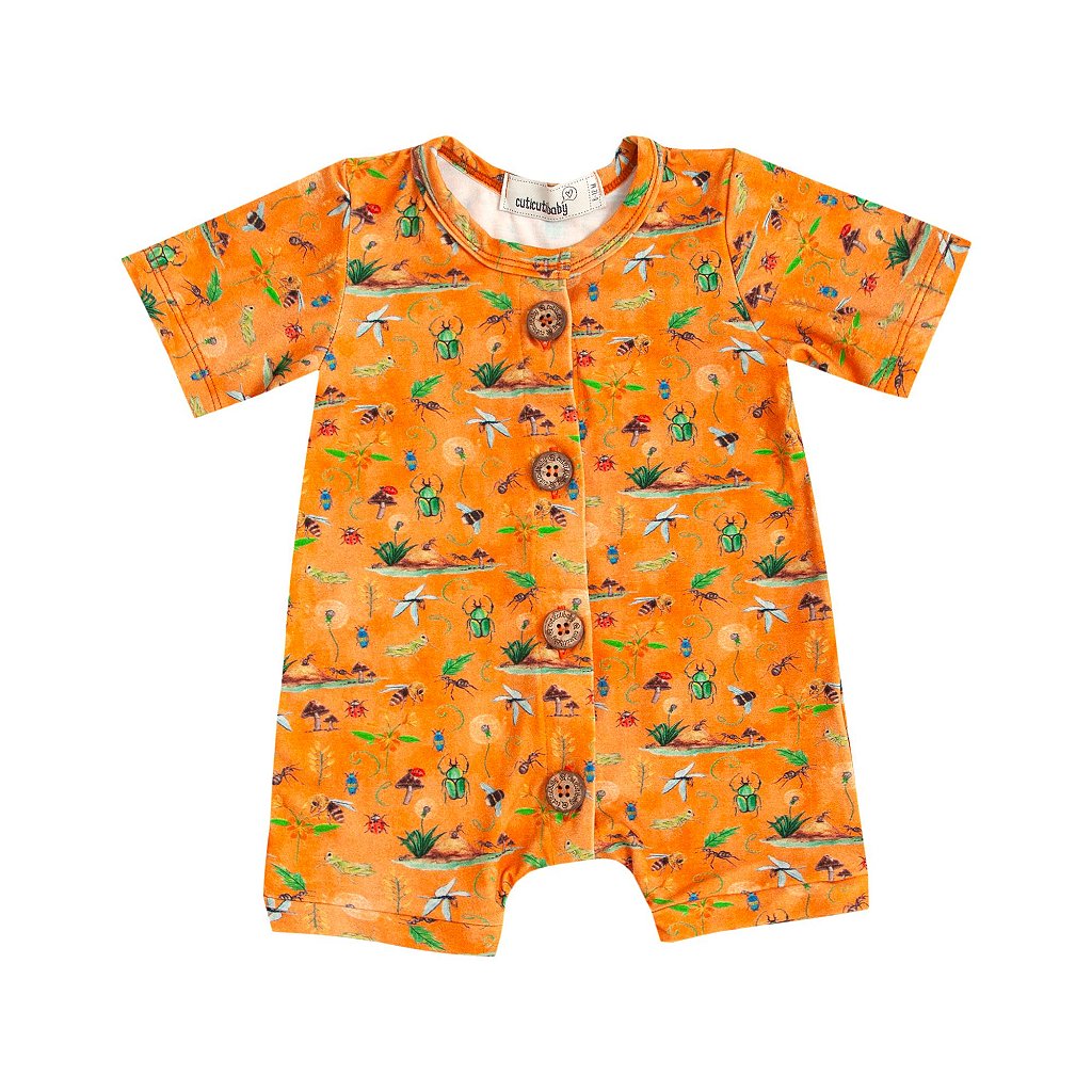 Macacão curto perfeito para o Verão, com aplicação de botão natural de coco personalizado na parte da frente.