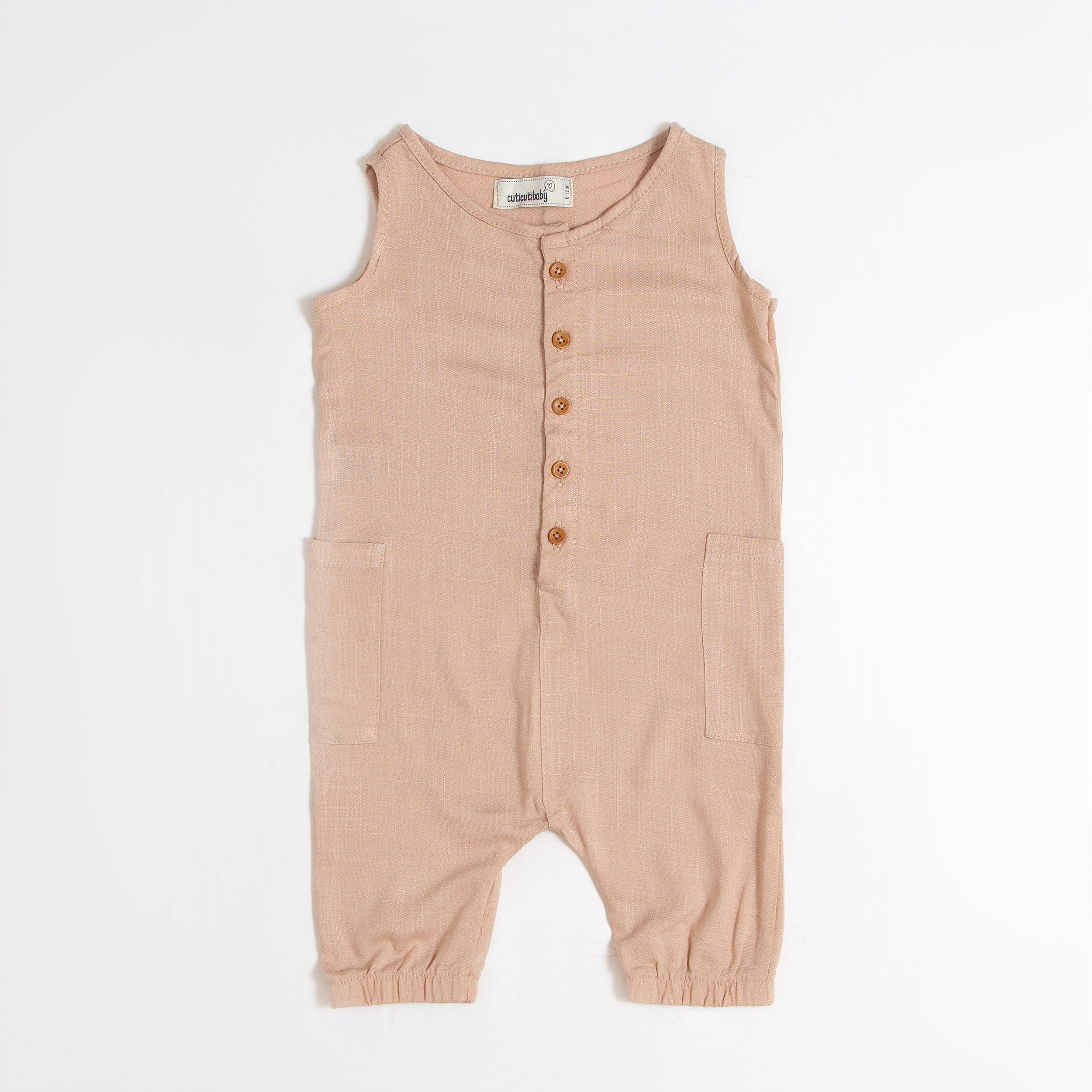 Macacão com modelagem saruel, mais folgadinho na parte de baixo feito em tecido algodão. Possui elastico nas perninhas e botãozinho de madeira para fechamento frontal, estiloso comfy e fresquinho para o verão.