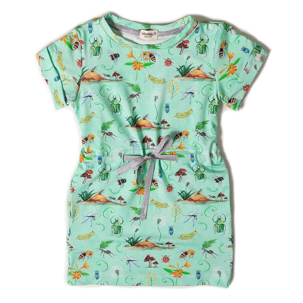 Estampa exclusiva Cuticutibaby Jardim dos Insetos, bichinhos aquarelados pintados a mão. Tem formiguinha e sua casinha, abelhinha, dente de leão, gafanhotos e besourinhos. Tudo feito com muito carinho. Para as peças de malha buscamos um tecido extremamente gostoso e confortável, fabricado com tecnologia estica-puxa que se adapta a todos os movimentos ativos dos pequenos. Vestido super confortável feito em malha com elastano, permite movimentos com a roupinha sem incomodar.